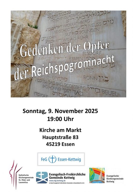 Am Sonntag, 09.11.2025, jährt sich zum 87. Mal die Reichspogromnacht vom 9. November 1938. Zum Gedenken daran findet um 19.00 Uhr in der evangelischen Kirche am Markt eine ökumenische Gedenkfeier statt. Anschließend gehen die Teilnehmenden gemeinsam an Stolpersteinen vorbei zum Gedenkstein der ehemaligen Synagoge in Kettwig vor der Brücke. Die Kettwiger Gemeinden laden zu diesem besonderen Abend alle Interessierten ein.