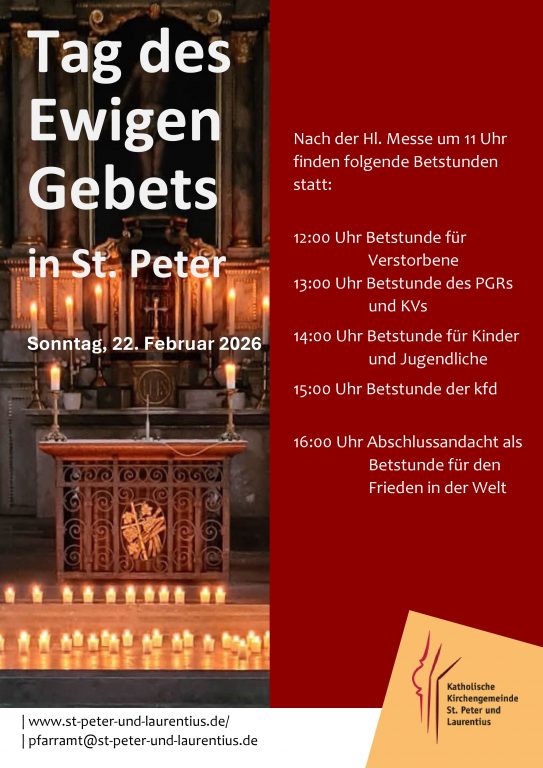 Am Sonntag, 22.02.2026, begehen wir den Tag des Ewigen Gebetes in St. Peter. Nach der Hl. Messe um 11.00 Uhr finden verschiedene Betstunden statt.